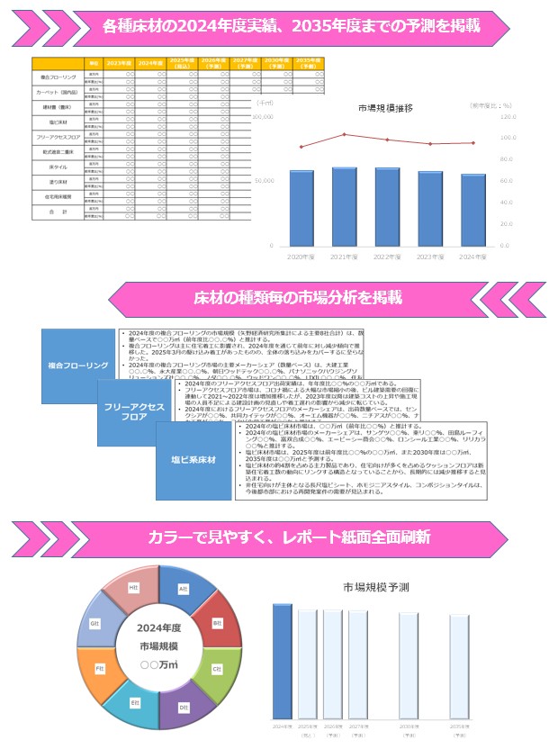 - 2024年度までの各床材の市場推移、2035年までの市場予測を掲載