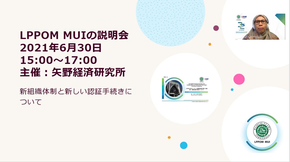 6月30日(水)に矢野経済研究所主催でオンラインにてLPPOM MUIディレクターによる認証手続きの新体制についての説明会(無料セミナー)は、80名近くの日本企業のご担当者に参加頂きました。これまで30年以上インドネシアのハラール認証機関としての実績を持つLPPOM MUIは、2019年にBPJPHより最初に政府公認のハラール検査機関として認定され、政府の法規制との整合性を維持しつつ認証を受ける企業側の現状と利便性を理解する立場から新しいルールや組織体制を検討してきております。この度、MUIのハラール判定の有効期限を4年に延長できるコンバージョン手続きやUAE等の輸出先国の規制に合わせる有効期限の新しいルール、認証取得手続きの短縮のための新しいルールについても説明されました。