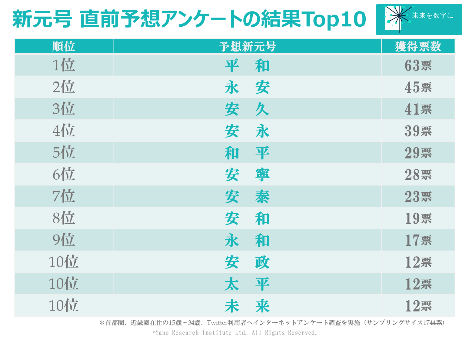 若い世代の方を対象に、先月下旬に行ったアンケート調査の中で、直前予想していただいた新元号の結果は以下の通りです。
