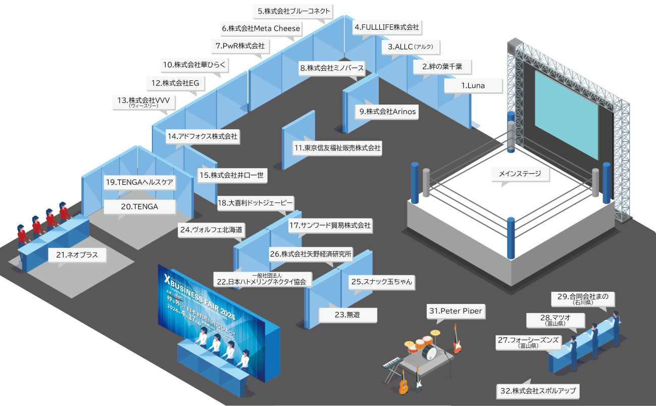 Xビジネスフェアは、「ボーダーレス」をテーマとした、企業の展示とステージプログラムで構成されております。会場にはプロレスリングが設置され、全ての講演がリング上で行われます。レスラーによるプロレスの試合もご覧いただけます。