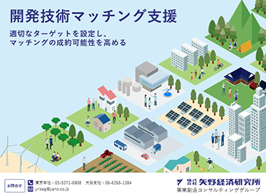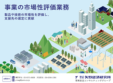 矢野経済研究所は、高い市場調査能力をもって、主として上場クラスの大手企業を中心とした様々な産業界の発展に寄与してまいりました。しかし、経営を取り巻く環境がますます複雑に。そして変化のスピードが想像以上に速くなる中で、「市場調査の結果の報告」に留まるのではなく、市場調査から導かれた戦略を実行レベルにおいて支援したいとの思いから、事業創造コンサルティングの事業を開始いたしました。