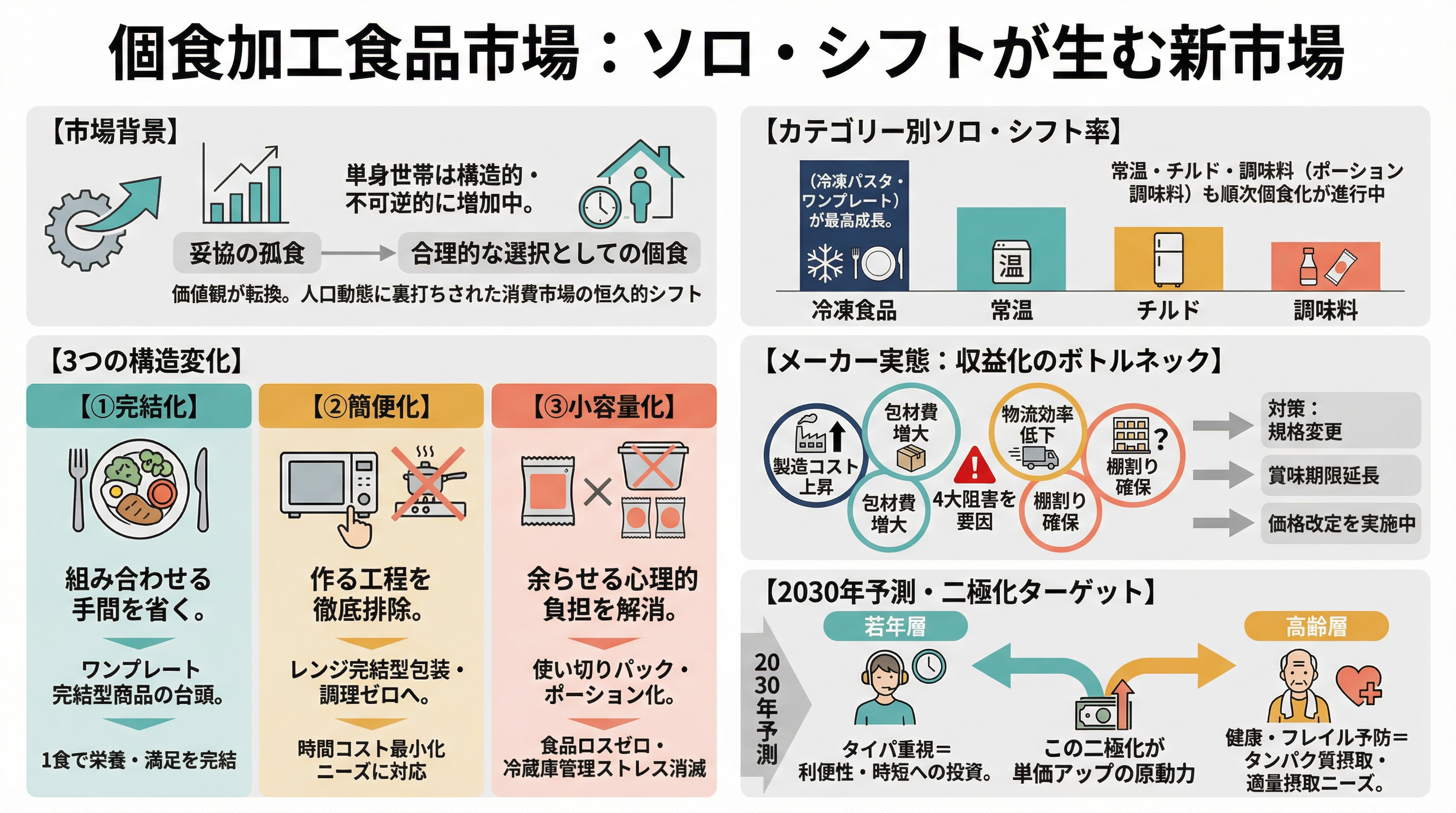 本レポートは、現状の市場実態と主要メーカーへのアンケート調査、先行企業の取り組み事例を通じ、変貌する「個食(ソロ)」市場の現在地を客観的に捉えることを目的としています。
