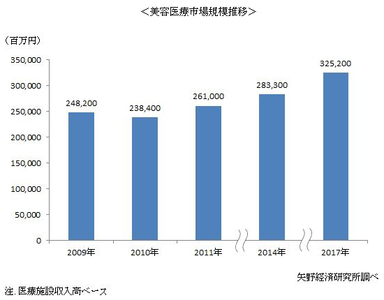 美容医療の市場規模は、2011年以降順調に成長しており、2017年は2014年比114.8%の325,200百万円となった。