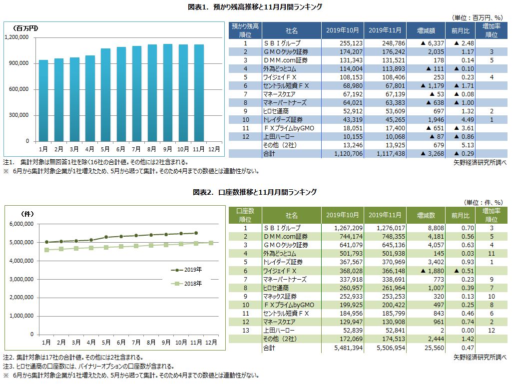 11月は前月比32.6億円減(0.29%減)となったが、本調査対象企業16社中7社(その他企業2社含む)で預かり残高が増加した。また、企業グループを加味した場合、前月比で最も高い増加率はトレイダーズ証券(4.49%増)、次いでヒロセ通商(1.32%増)であった