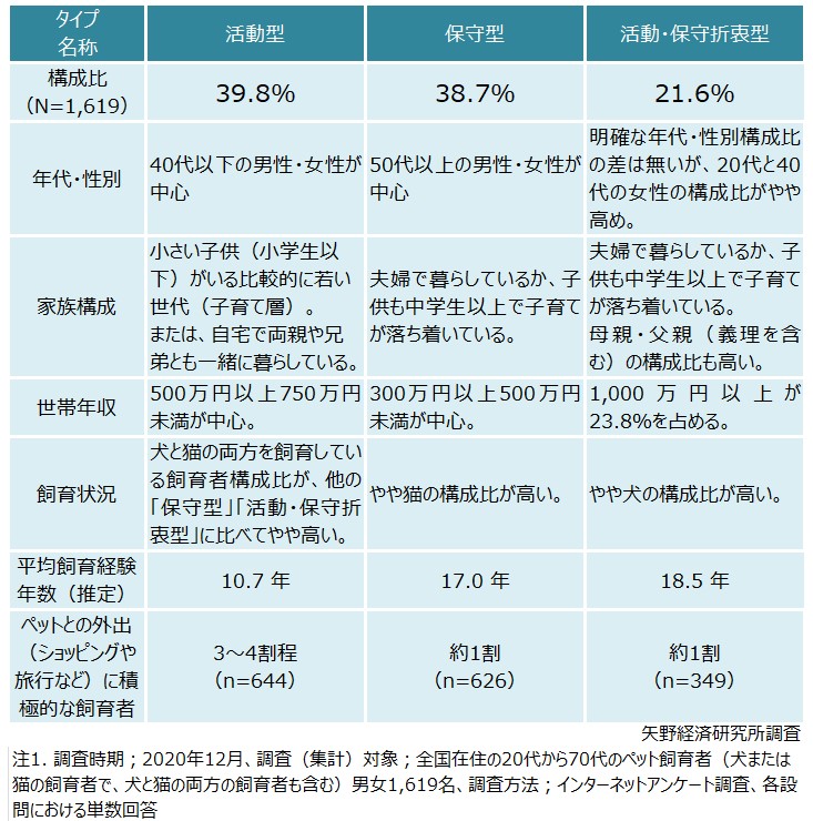 本分析結果から、ペット飼育者層は、大きく「活動型」の4割と「保守型」の4割に分けられることがわかった。「活動型」グループは、概して年齢が40代以下を中心に、小学生以下の子供がいる子育て層で、飼育経験年数が平均で10年程度である。当該グループのうちペットとの外出(ショッピングや旅行など)に積極的な飼育者は3~4割を占める。また、「保守型」グループは、概して年齢が50代以上を中心に、子供が中学生以上で子育ても落ち着き、飼育経験年数が平均で17年程度である。当該グループのうち、ペットとの外出(ショッピングや旅行など)に積極的な飼育者は1割程度を占める。
