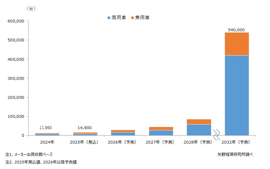 2025年以降、主要自動車メーカーからFCV(燃料電池車)の新モデルが市場に投入されることで、乗用車向け燃料電池システム市場は回復基調に転じると想定する。商用車向けでは中国に加え、欧州や日本でもトラックやトレーラー用の需要が本格化し、乗用車向けよりも高い市場成長率で推移するとみる。この結果、2032年の自動車用燃料電池システムの世界市場規模(メーカー出荷台数ベース)は540,000台になるものと予測する。
