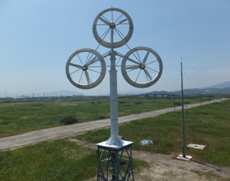 - 3kWの小型レンズ風車を基本ユニットとし、これを3基集合させた「マルチロータシステム」とすることにより、高効率化、低コスト化を実現した小型風力発電システム。