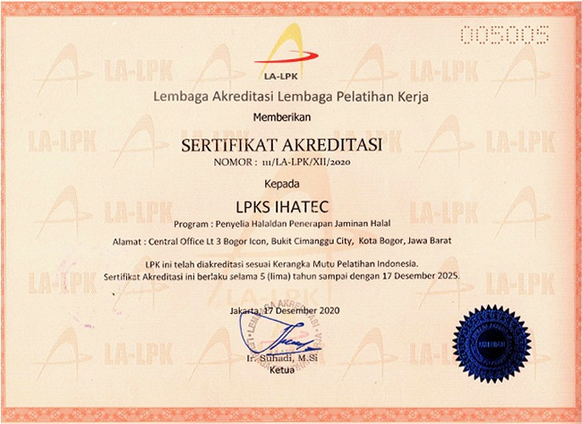当研修は、インドネシア政府公認の研修機関であり、インドネシアのハラール認証機関LPPOM MUIのグループでもあるIHATECとの協力によるインドネシアのハラール認証の研修です。