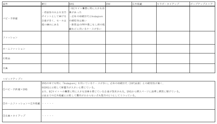 自社の業界の動向や効果から「販売促進の有効性を確認できる」調査、普段関わらない他業界の販売促進の手法から「自社にとって新たな販売促進へのヒント」になる調査として、提案をさせていただきます。