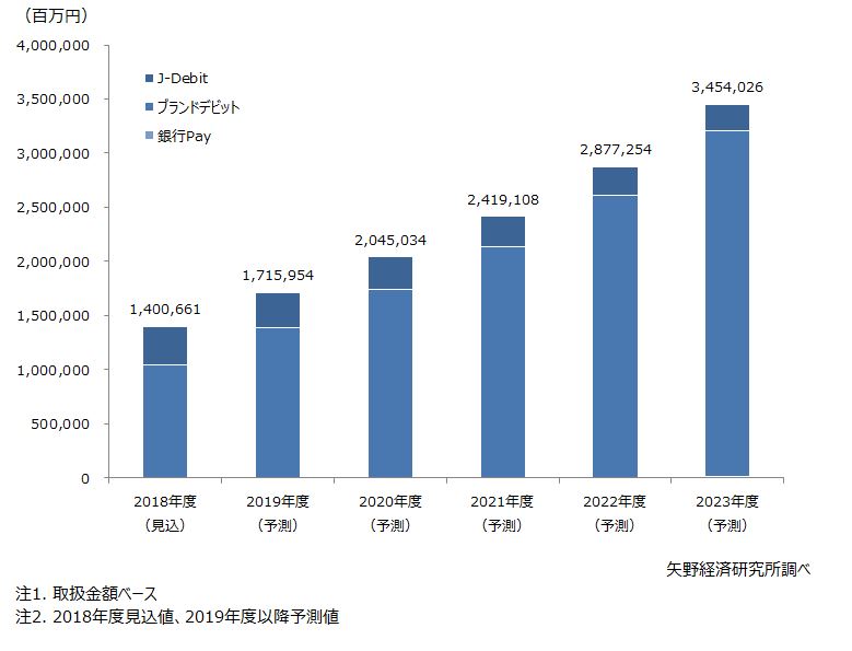 2018年度の国内デビットカード市場規模は前年度比123%、1兆4,006億円の見込