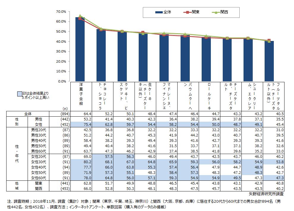 2018年11月に和菓子・洋菓子・デザート類・コンビニスイーツについて関東(東京、千葉、埼玉、神奈川)と関西(大阪、京都、兵庫)に居住する20代から60代までの男女合計894名(男性442名、女性452名)に実施した消費者アンケート調査によると、直近1年間の贈答・ギフト用途における洋菓子の購入有無(単数回答)について、購入したことがある層は全体で64.4%であった。対象品目別でみると、特にチョコレート、ショコラ(52.2%)、クッキー、ビスケット(50.1%)は全体で半数以上が購入有との結果であった。男女別でみると、全ての対象品目で男性より女性の方が購入有の回答比率が高い結果となった。
