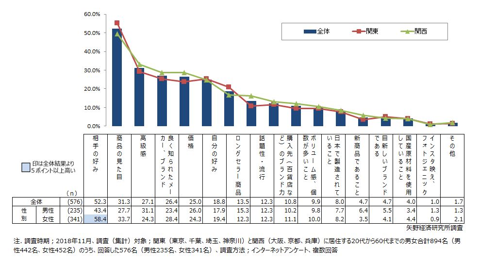 相手の好みが男女ともに他の項目よりも突出して高い回答比率となっているのは、ギフトを贈る相手が身近な親しい相手へと変わってきており、「贈り先ファースト」の価値観が高まってきているためと推察する。また、男性が高級感をより重視するのは、男性の方が自分より目上の相手にギフトを贈る機会が相対的に多いものと考える。
