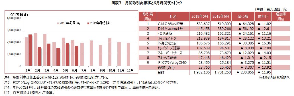 2019年6月の月間取引高は、有力FX企業12社*1の合計で170兆円(百万通貨を1億円として換算)となった。2019年6月の月間取引高の第1位はGMOクリック証券で51.9兆円(同)、第2位はDMM.com証券で38.9兆円(同)であった。