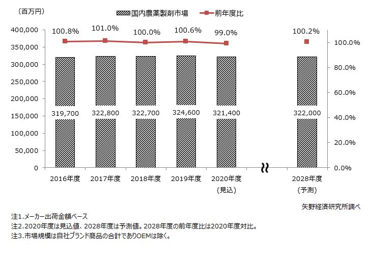 2020年度以降も、作付面積の減少や減農薬の動きなど厳しい状況は変わらず続くと考えられることから、市場は横這いで推移する見通しとなり2028年度の農薬製剤市場は、3,220億円(2020年度比100.2%)になると予測する。