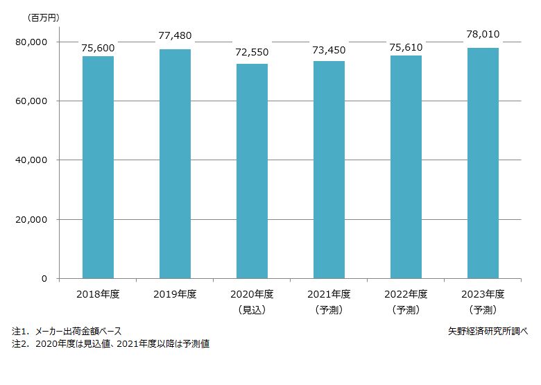 半導体製造設備や情報通信設備、バイオマス発電設備などの熱交換器需要が引き続き堅調に推移するとともに、その他の分野でも設備投資の動きが回復し、2020年度を上回る見通しである。国内の熱交換器の需要は今後徐々に回復し、2019年度の水準に戻るのは2023年度頃の見込みである。2025年の大阪万博に向けた設備投資の動きやカーボンニュートラルに対応した製品開発・用途開拓により、2023年度の高効率熱交換器市場規模は780億1,000万円になると予測する。