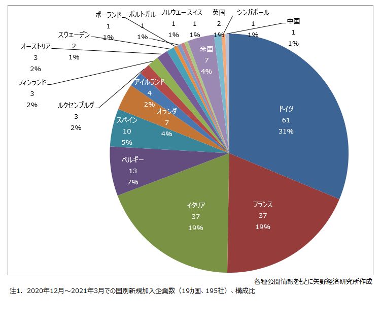 また、2020年12月から2021年3月までの新規加入企業は合計で195社で、累計で約550社ほどに拡大している。新規加入の内訳をみると、ドイツ企業が61社(構成比31%)と最も多く、次いでフランス、イタリアがそれぞれ37社、ベルギー13社、スペイン10社となっている。また、EU圏外からは、米国から7社、英国が2社、中国やシンガポールからもそれぞれ1社の企業が参加している。今後、他国や他国企業に遅れを取らないよう、日本や日系企業はデータ流通の規格や実装に向けて、官民一体となった取り組みが求められていくと考える。
