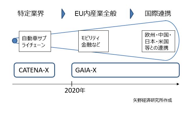 GAIA-Xは、ドイツの「インダストリ4.0」の進化形とも言える、自動車産業のサプライチェーン・ネットワークであるCatena-Xを取り込み、パイロットプロジェクトを始動させている。GAIA-Xは既にドイツ工業規格は取得済みであり、欧州規格から国際規格への進展を図るとともに、今後はモビリティや金融をはじめとした他の産業へと横展開できるか否かが普及のカギとなる。
