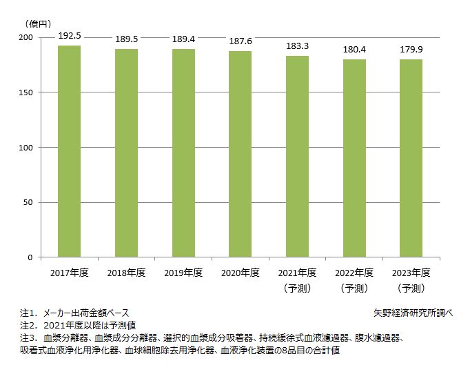 アフェレシス市場全体の市場規模(8品目合計)は、2021年度以降横ばいまたは微減基調で推移すると予測する。これは一部の療法は実施回数が減少傾向にあることや、薬物治療など他の療法が増加することなどを考慮した。一方、腹水濾過器市場や持続緩徐式血液濾過器市場は、療法の実施回数や対象患者数が増加傾向にあることなどから、今後も堅調に推移していく見込みである。