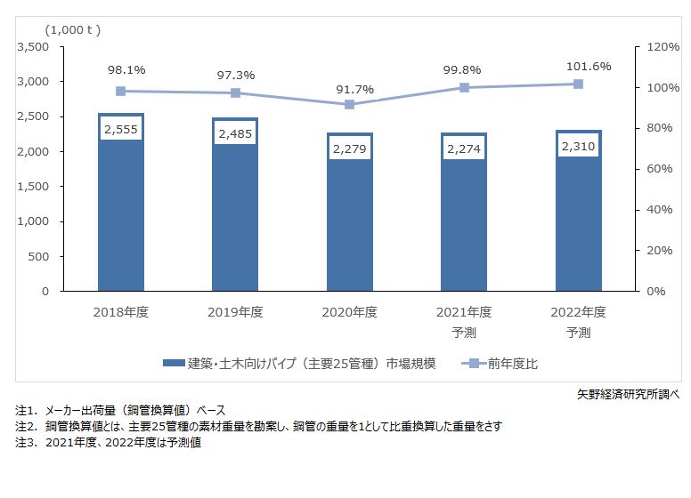 2021年度の建築・土木向けパイプ(主要25管種)の市場規模は、メーカー出荷量(鋼管換算値)ベースで前年度比0.2%減の227万4,000トンと予測する。