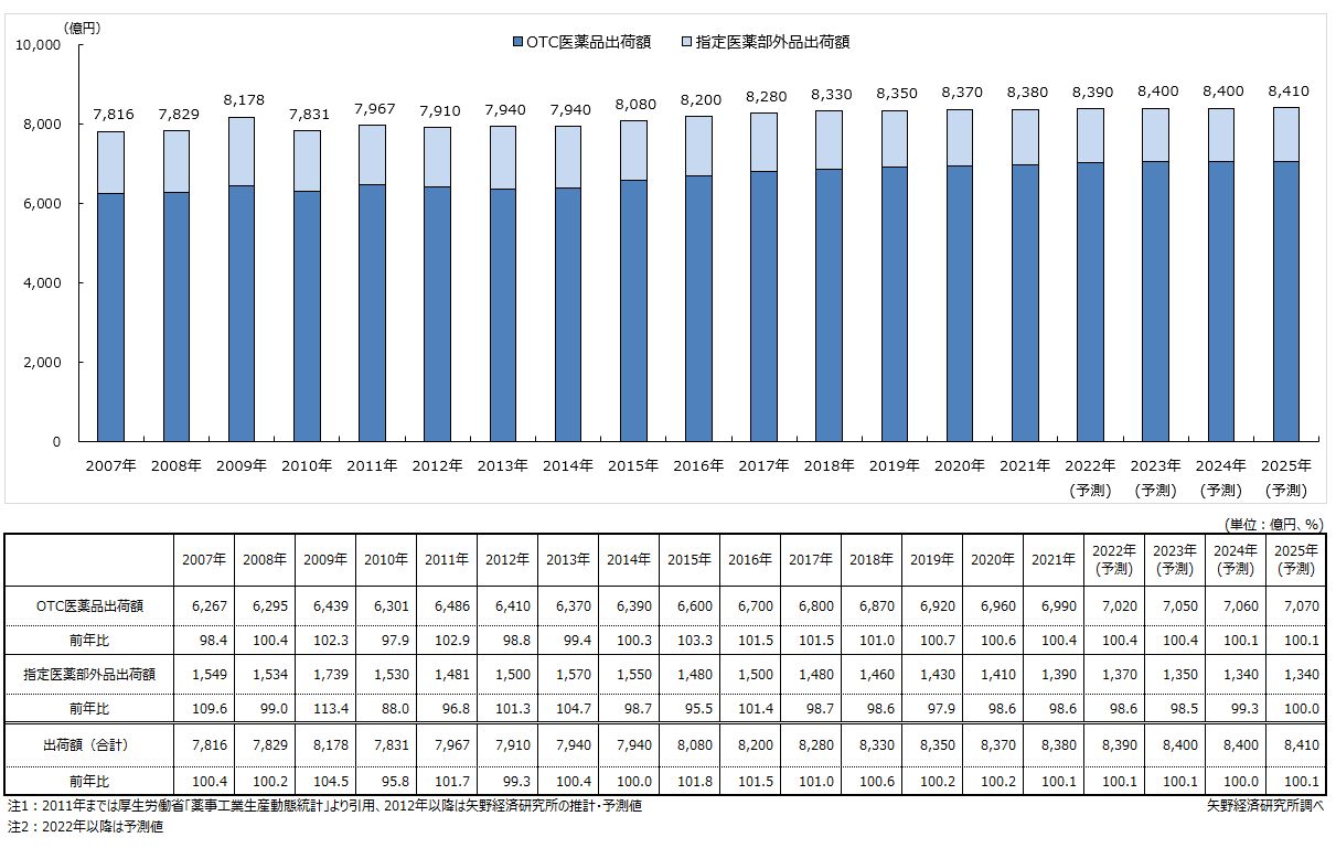 2022年のOTC市場は前年比0.1%増の8,390億円に留まるものと予測する。内訳は、OTC医薬品が同0.4%増の7,020億円、指定医薬部外品が同1.4%減の1,370億円である。