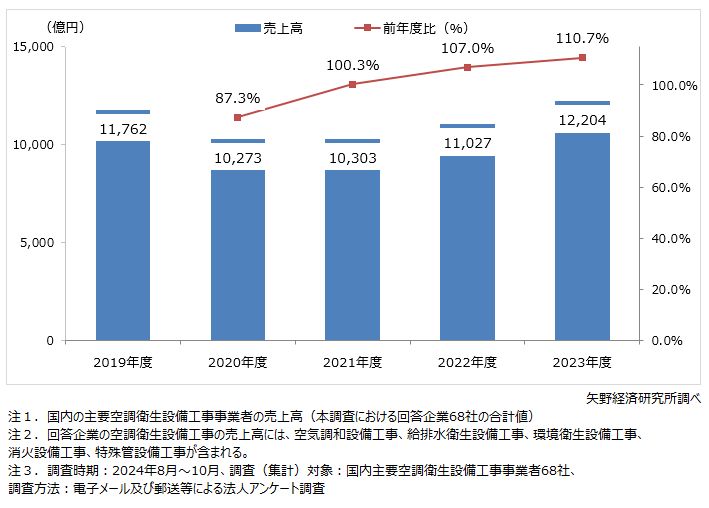 国内の主要な空調衛生設備工事事業者68社の2023年度工事売上高は前年度比110.7%の1兆2,204億円