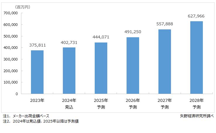 2024年の放熱部材世界市場は4,027億3,100万円と見込み、2028年の同市場は6,279億6,600万円まで成長すると予測する。