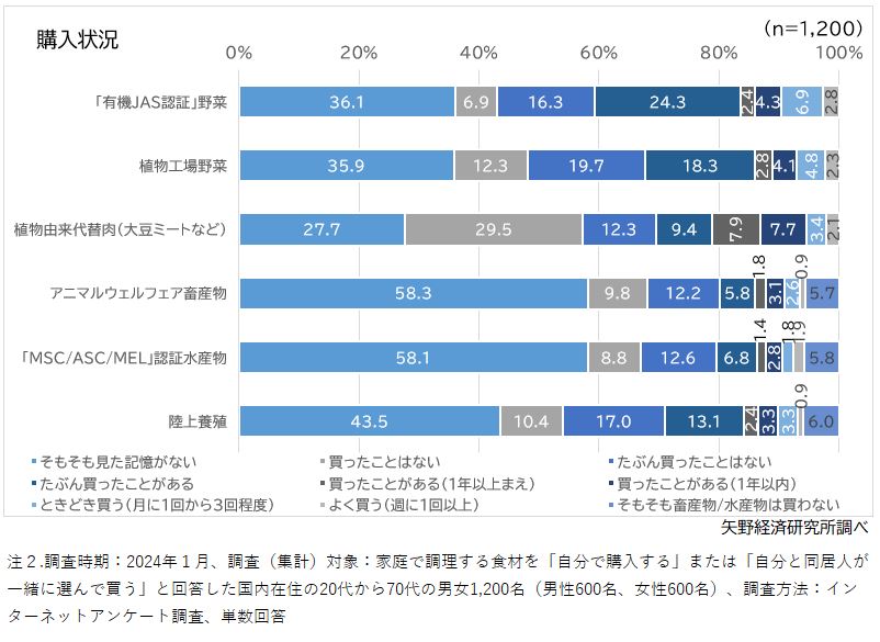 本消費者アンケート調査は2024年1月に、家庭で調理する食材を「自分で購入する」または「自分と同居人が一緒に選んで買う」と回答した国内在住の20代から70代の男女1,200名に対し、サステナブルフード7分野(①「有機JAS認証」野菜、②植物工場野菜、③植物由来代替肉(大豆ミートなど)、④培養肉、⑤アニマルウェルフェア畜産物、⑥「MSC/ASC/MEL」認証水産物、⑦陸上養殖)を対象に認知状況や購買状況、購入要件などについて実施し、機械学習(AI分析)と統計的分析手法を用いて消費者の潜在需要を考察した。ここでは一部の結果を公表する。なお、回答者には各7分野のサステナブルフードについての簡単な解説文を提示した上で、本アンケート調査を実施している。